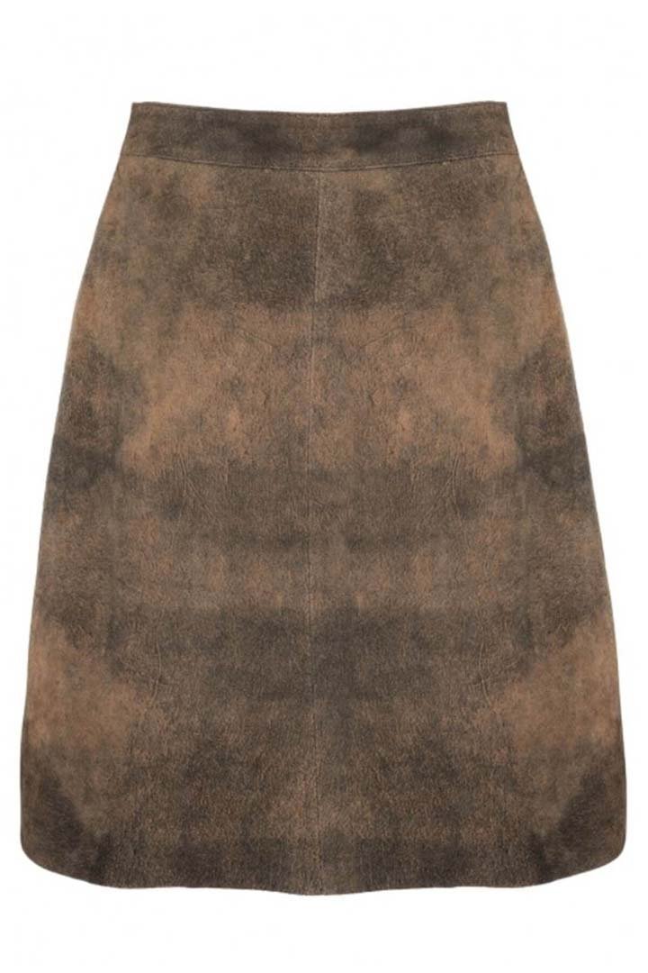 Discover genuine craftsmanship in this high-end goat suede leather skirt. Its velvety quality and worn brown hues provide a chic interpretation of Alpine history that goes well with traditional blouses for any festive event.