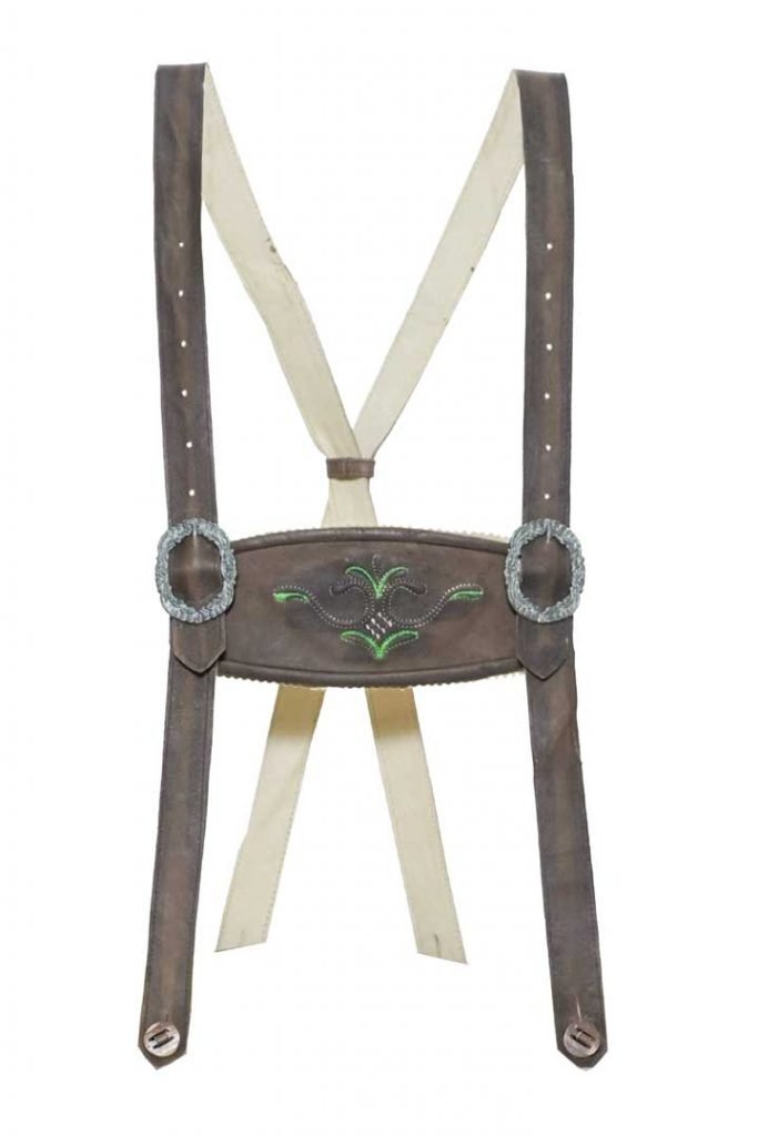 These goat suede leather braces with elaborate green stitching and antique-style buckles are an example of fine craftsmanship. For any traditional German ensemble, these adjustable straps offer a secure fit and classic style. You will always look your finest at any occasion thanks to their rich earthy tones and delicate texture.