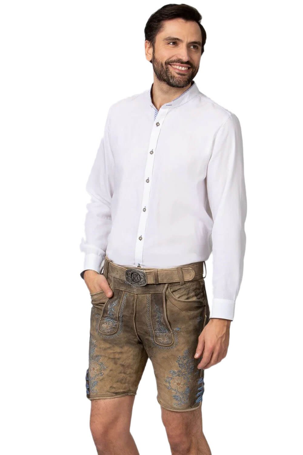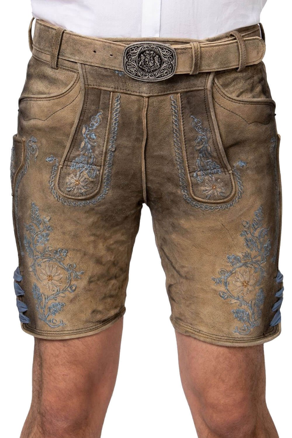 Crafted from soft goat suede leather, this Linderhof Palace Lederhosen delivers a smooth and velvety feel. The natural grain gives it a warm, earthy tone, and the blue embroidery adds a gentle contrast. Because of its refined texture, these Trachten Shorts work well for festive events and relaxed outings. The color shifts slightly in the light, which enhances the authentic character.