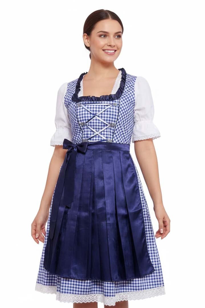 This high-quality cotton set lets you experience real German craftsmanship. This suit has a classic blue checkered pattern with a silky pleated apron. It’s comfortable and has a traditional alpine look that works for any holiday.