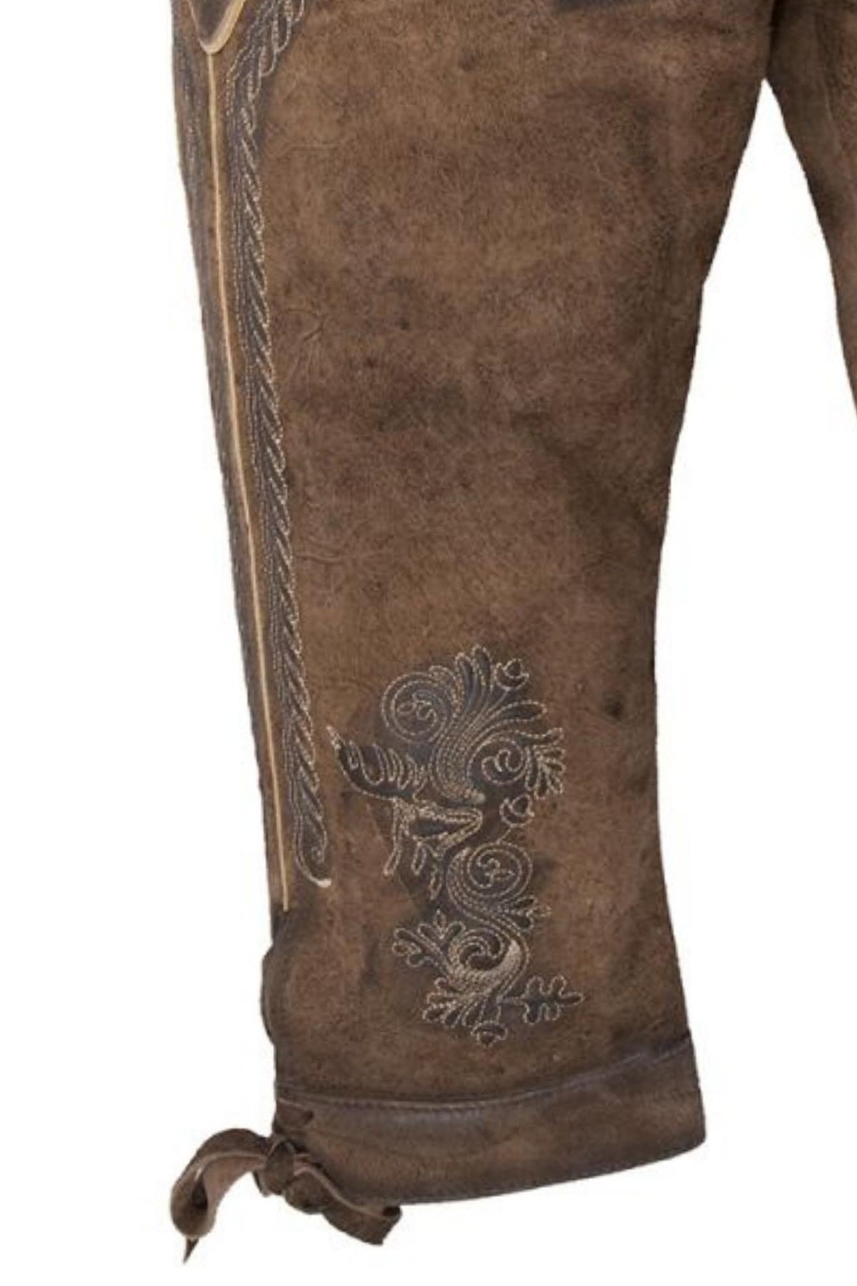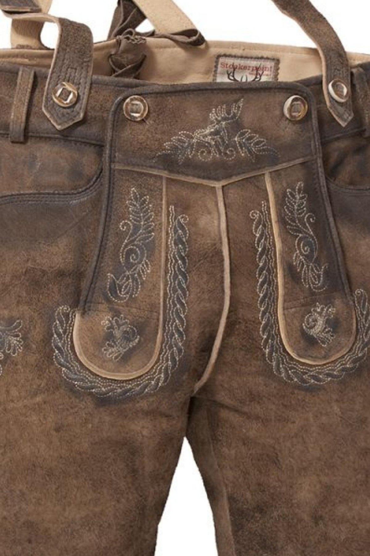 Master embroiderers masterfully use cream threads to sew exquisite light-toned Bavarian motifs on the bib, pocket flaps, and legs. With adjustable leather suspenders and fancy metal buckles, you can get a great and secure fit. The suspenders also include matching embroidered accents. Also, the typical leather ties at the knees make it easy to change the shape of the pants.