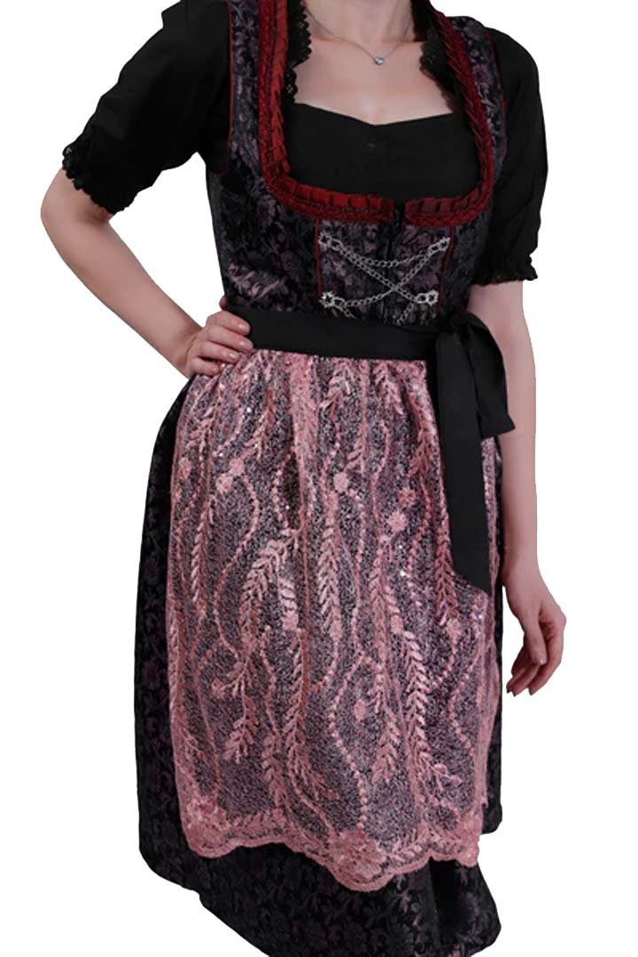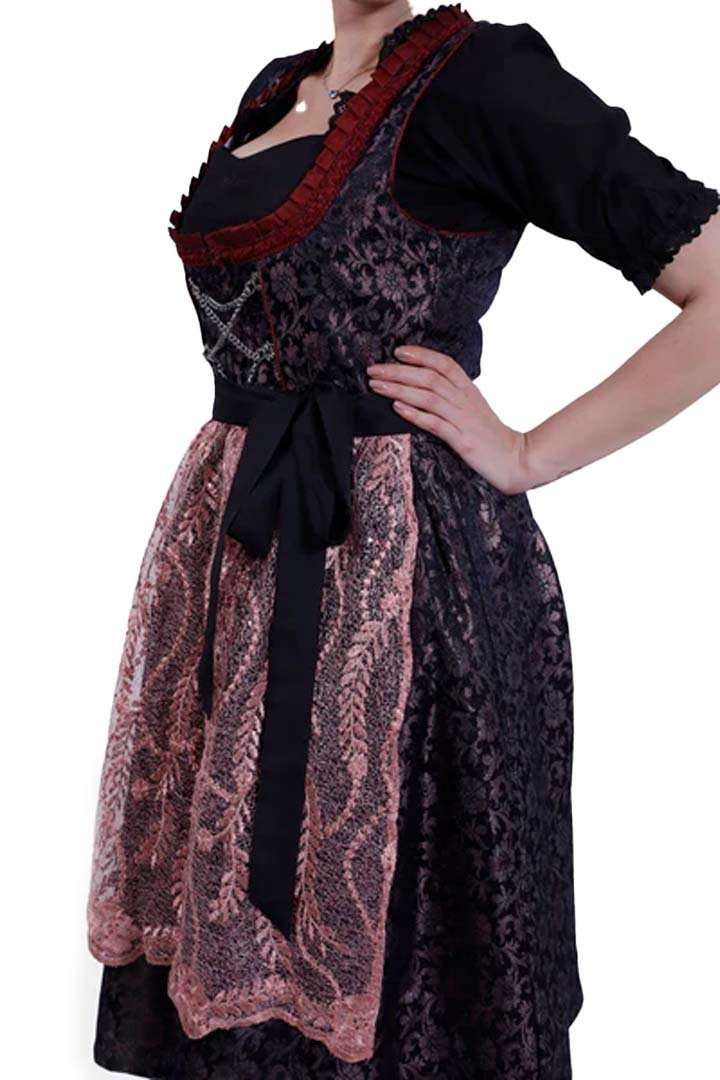 This stunning Christina Hänni Dirndl captures Alpine tradition with a sophisticated blend of deep obsidian and dusty rose. The bodice uses premium cotton with a subtle damask weave to add rich texture and depth. Moreover, deep red ruffled trim frames the neckline, while silver chain detailing enhances the refined look. Therefore, this German Dirndl Dress perfectly balances heritage craftsmanship with modern feminine elegance.