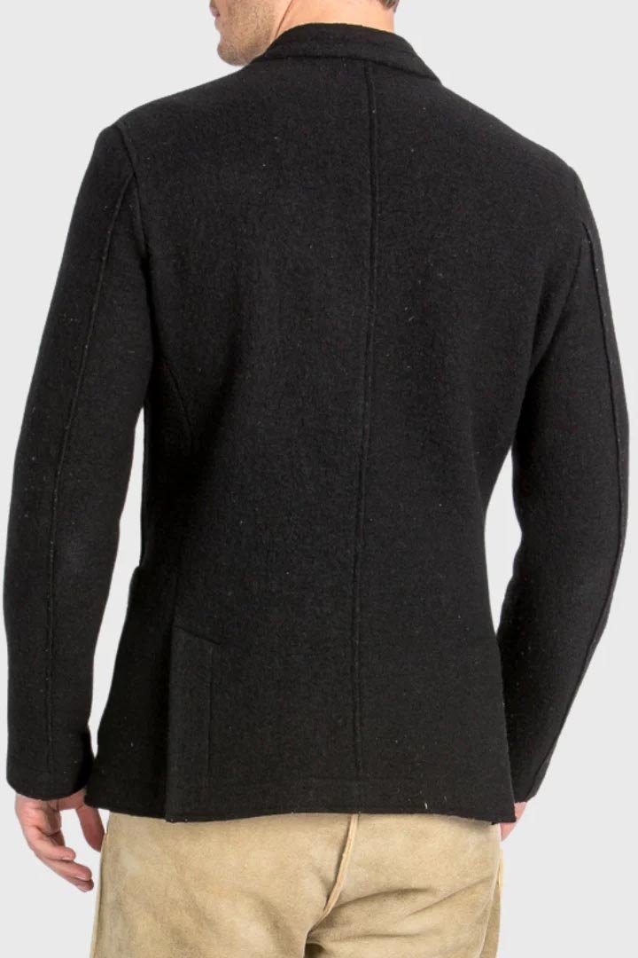 Crafted with care, this refined outerwear piece showcases a smooth yet slightly textured wool surface that feels both sturdy and soft to the touch. The deep black color adds a bold, confident character while maintaining timeless Alpine charm. Moreover, the structured tailoring enhances the natural silhouette, creating a balanced look that feels elegant and authentic. Because of its premium wool construction, it delivers warmth, breathability, and lasting comfort throughout festive or seasonal wear.