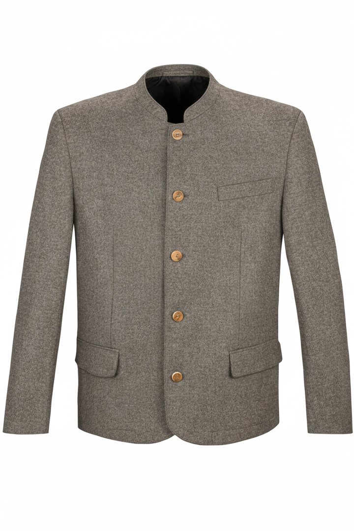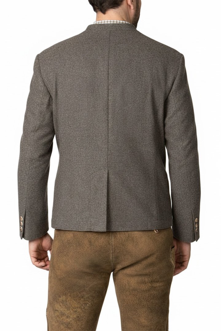 This high-quality Gray wool blazer will help you look like a true Bavarian. It has traditional horn buttons and a sleek stand-up collar, making it a stylish layer that goes well with both classic and modern Alpine clothing.