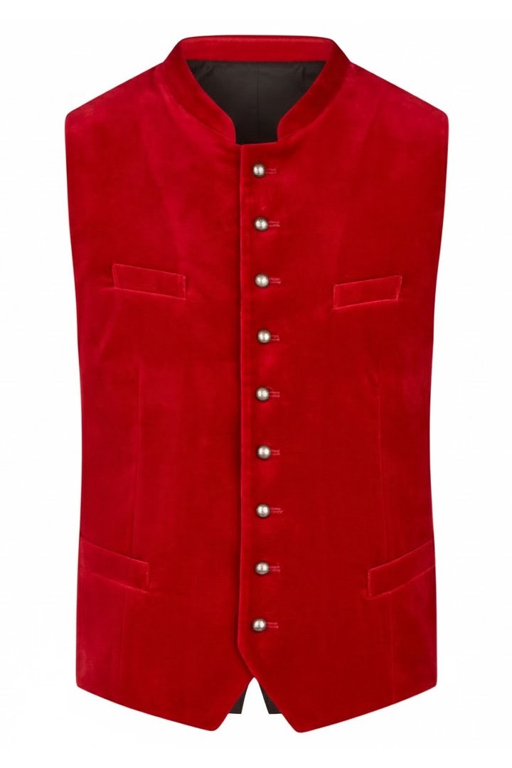 With this finely designed Alpine vest, you can feel the opulence of fine red velvet. It adds a hint of aristocratic appeal to any heritage-inspired ensemble with its slim fit and traditional silver buttons.