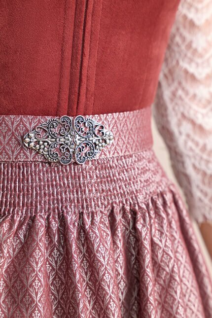 This dirndl blends a velvety rose bodice with a softly patterned pink skirt, creating an elegant and feminine look. Its lace blouse adds light detail, while the apron completes the refined style. Comfortable tailoring and gentle colors make it ideal for festive occasions and graceful traditional events to wear anywhere.