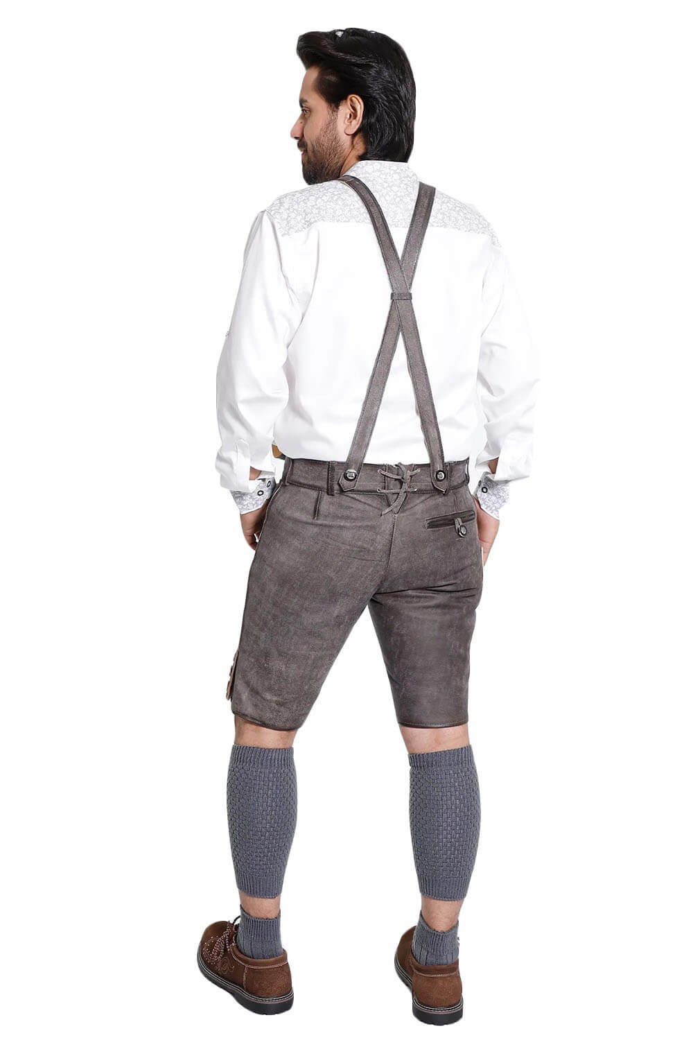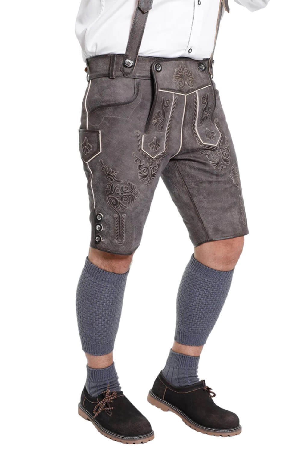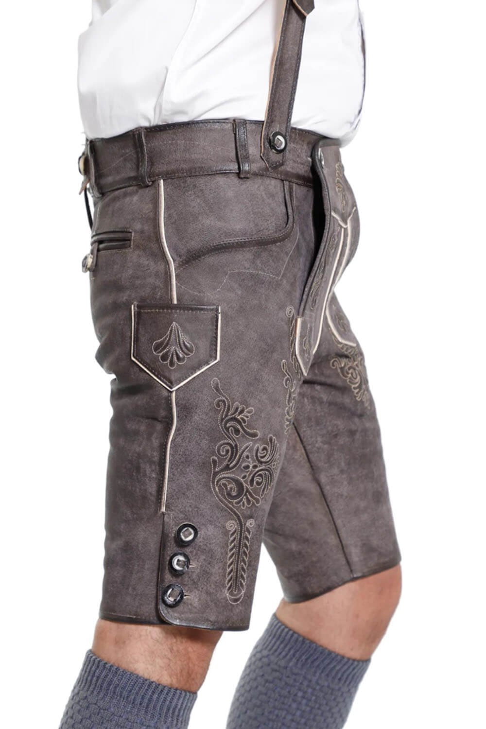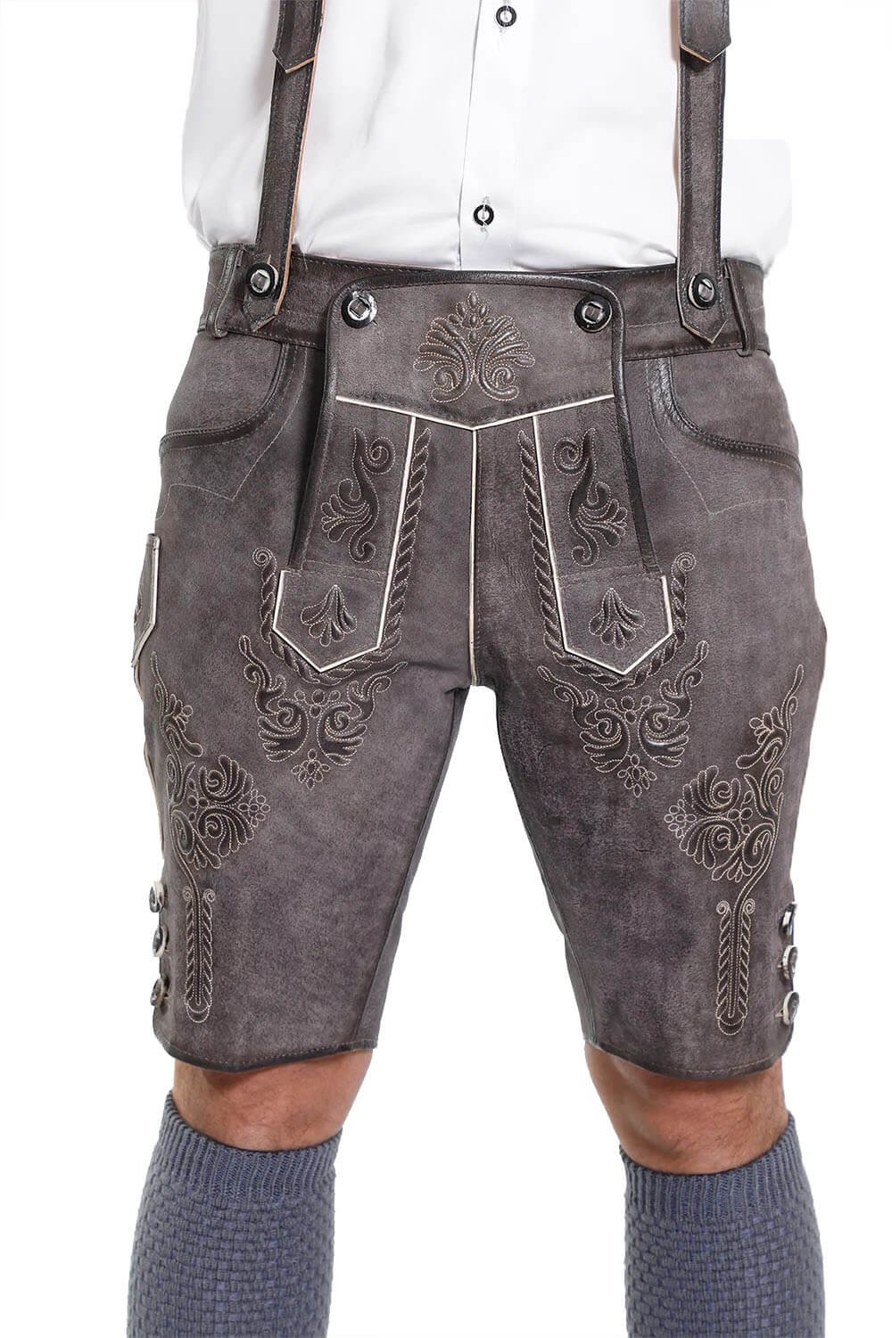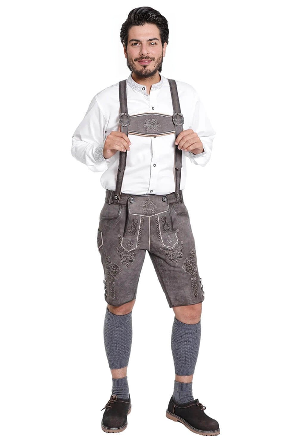 Bavarian Attire’s Geneva Lederhosen combines expert craftsmanship with heritage. It is made of smooth, soft goat suede leather with a subdued grey-brown hue. For festive occasions, it looks well with a Men’s Traditional Outfit and the intricate embroidery is really noticeable. All in all, it provides a sophisticated and timeless appearance.