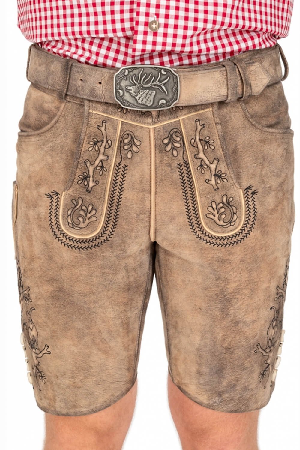 These stunning mens lederhosen are crafted from goat suede, displaying a rich, distressed brown color and a soft, supple texture. Consequently, the deliberate distressing gives them an authentic, vintage look, making these lederhosen shorts ideal for any bavarian lederhosen event. Furthermore, this high-quality material is a key feature of this specific traditional garment.