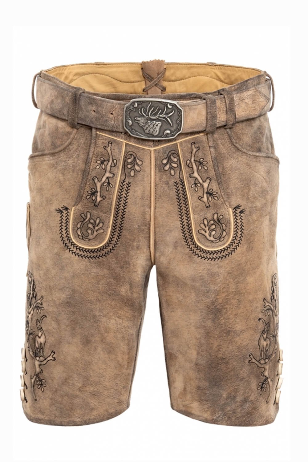 Moreover, these specific oktoberfest lederhosen feature intricate embroidery in dark thread, which beautifully contrasts with the soft, faded hue of the goat suede. In addition, a matching leather belt with a metal stag buckle reinforces the rugged, alpine heritage of these trachten lederhosen. Therefore, the combination of luxurious leather and exquisite handiwork makes them a truly premium choice.