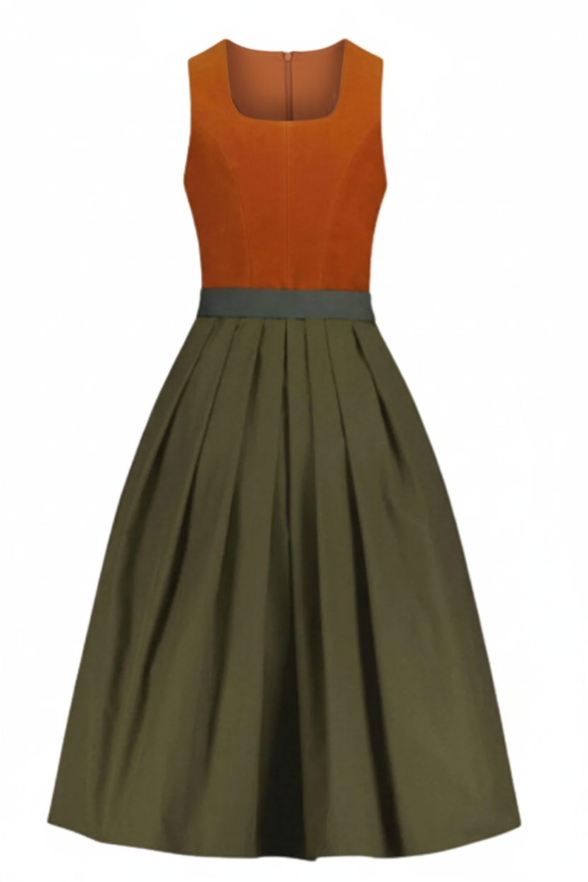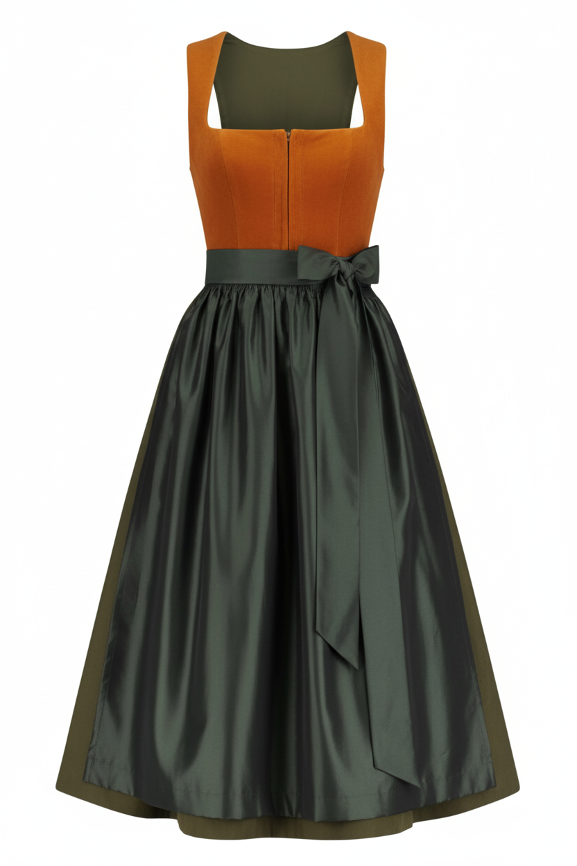 • Material: Burnt-orange velvet bodice with glossy olive satin skirt.
