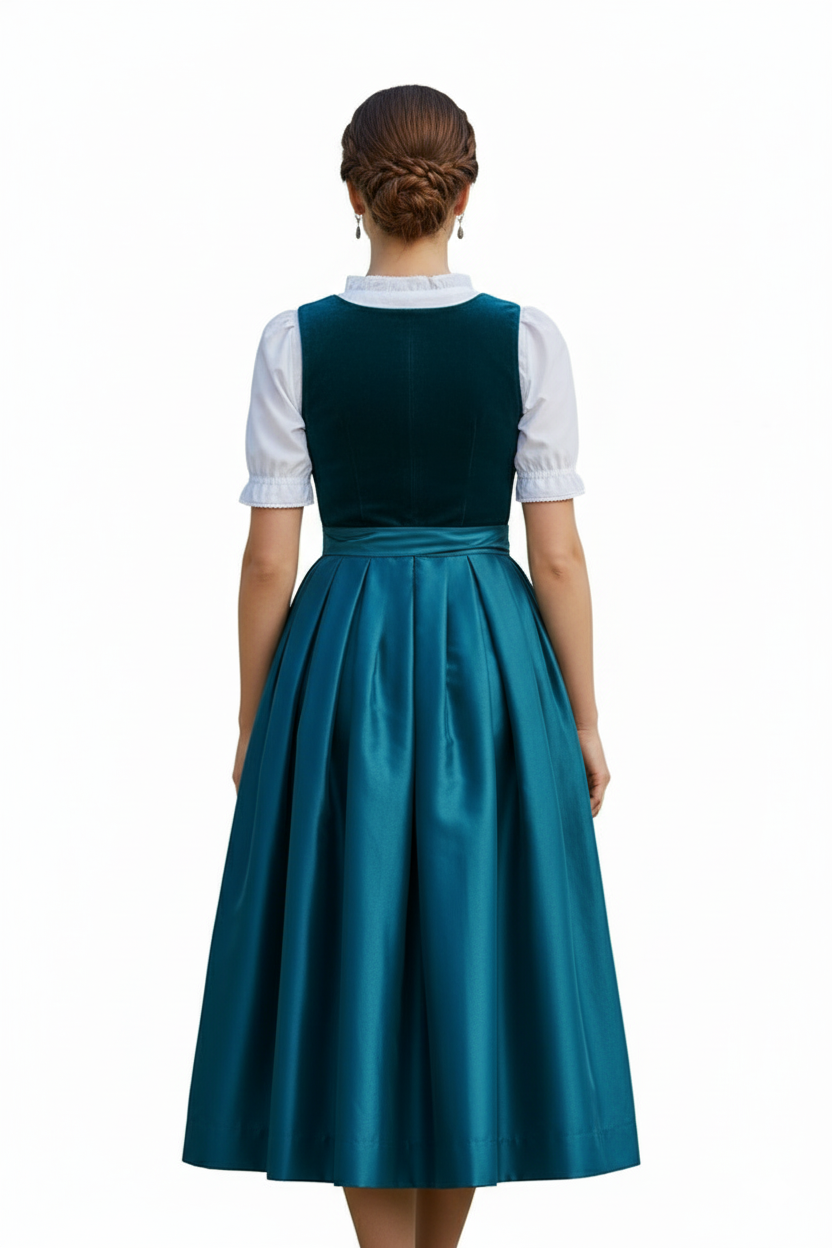 The Claudia Dirndl features a rich teal velvet bodice with a soft, smooth finish that reflects the elegance of a Velvet Dirndl. Its satin skirt adds a gentle sheen, creating a calm contrast with the matte upper texture. Together, these elements bring a refined balance that suits modern Trachtenmode.