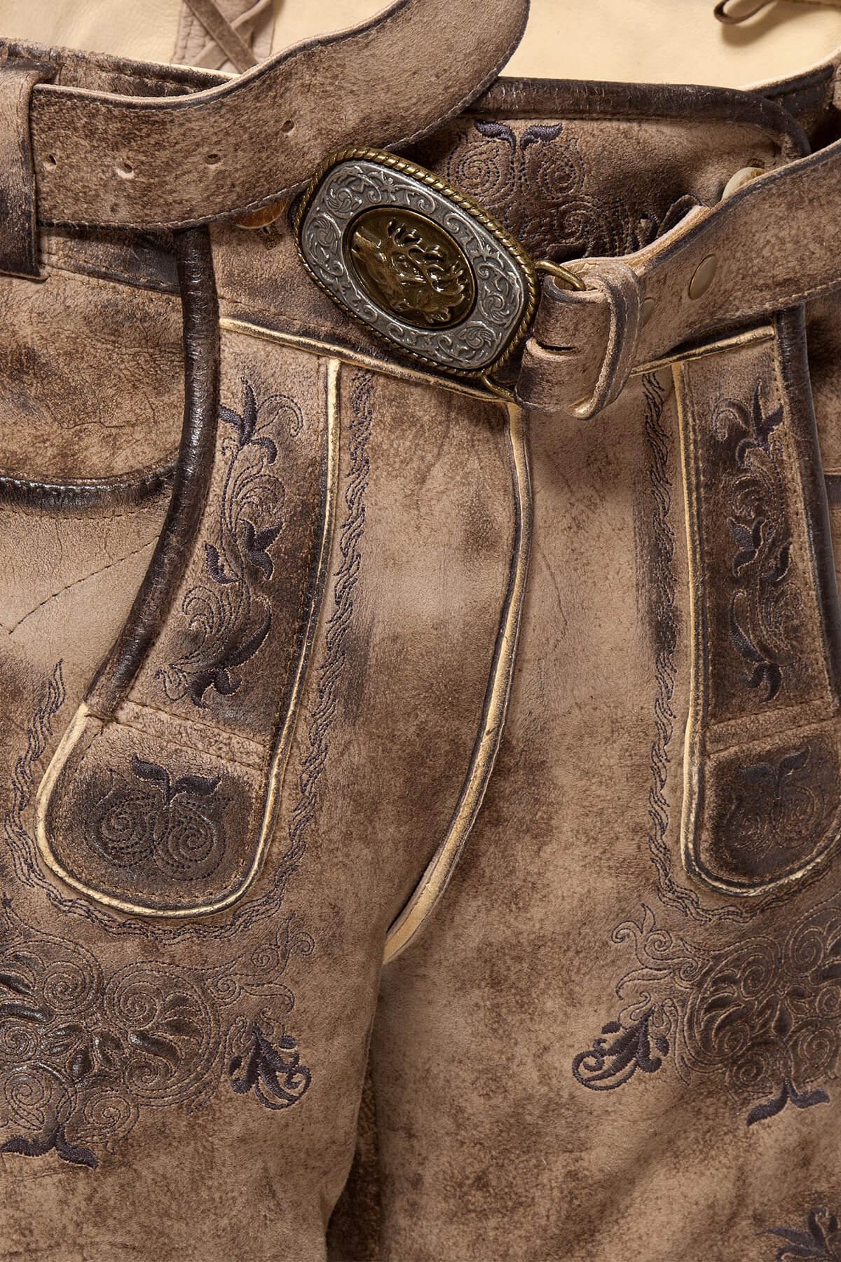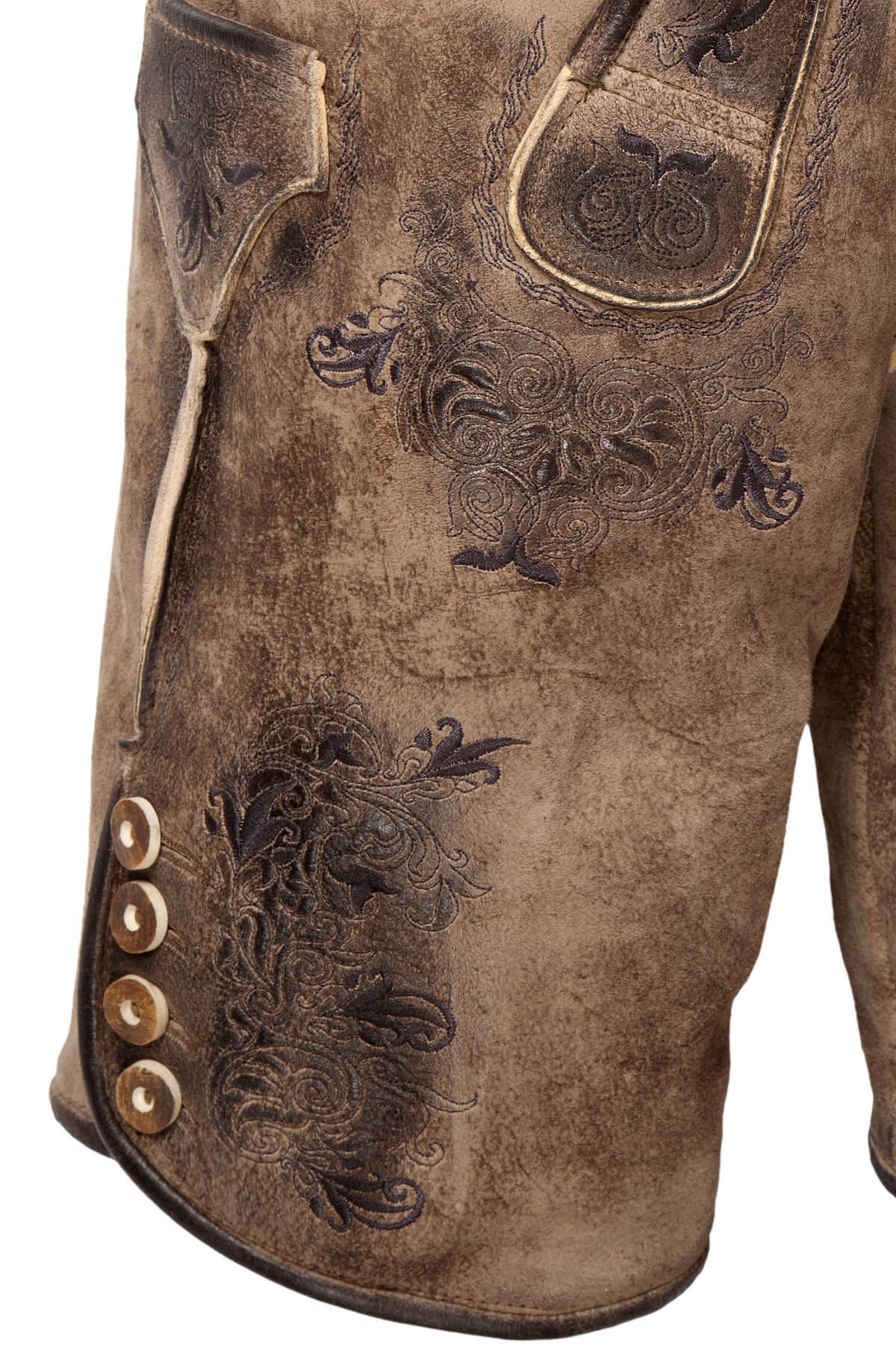 This “Danube Lederhosen” by Bavarian Attire has a distressed goat suede leather texture and a deep, earthy brown colour. In addition, the surface is purposefully worn and napped for an antique appearance, which is enhanced with elaborate, dark scroll embroidery. As a result, the rustic attractiveness of the garment is enhanced by this design on the front and sides. In the end, the entire style represents a true Bavarian outfit.