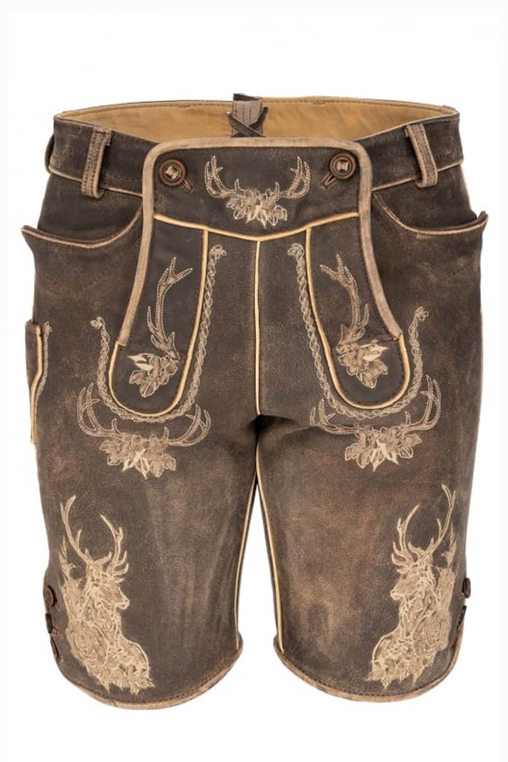 Goat suede is used to make these high-quality, short brown leather trousers from Bavarian Attire. They capture an authentic, rustic German look ideal for cultural events or costume parties with their intricate, lighter-toned needlework of classic motifs, such as stag heads.