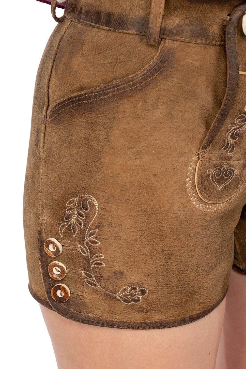 The texture of these Women’s Lederhosen feels exceptionally soft because artisans craft them from premium goat suede leather. As a result, the velvety surface remains gentle on the skin during long celebrations. Unlike stiff synthetic fabrics, the natural suede grain allows airflow and flexibility. Furthermore, the design pairs beautifully with various Women’s Shirts, from simple cotton to elegant lace styles.