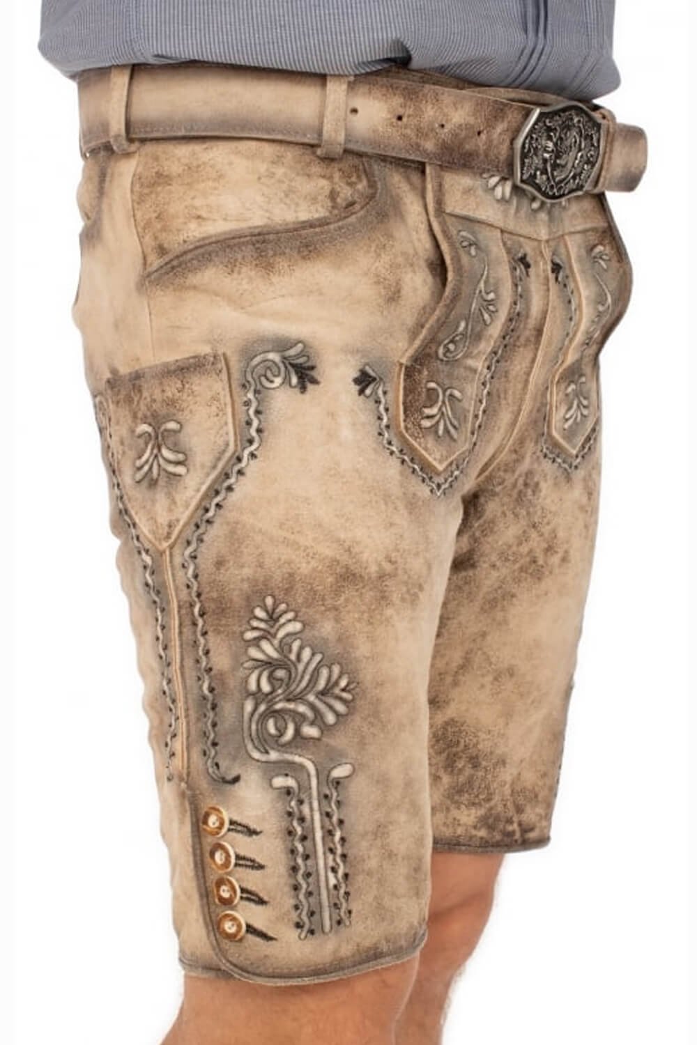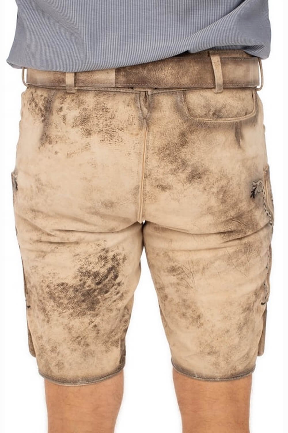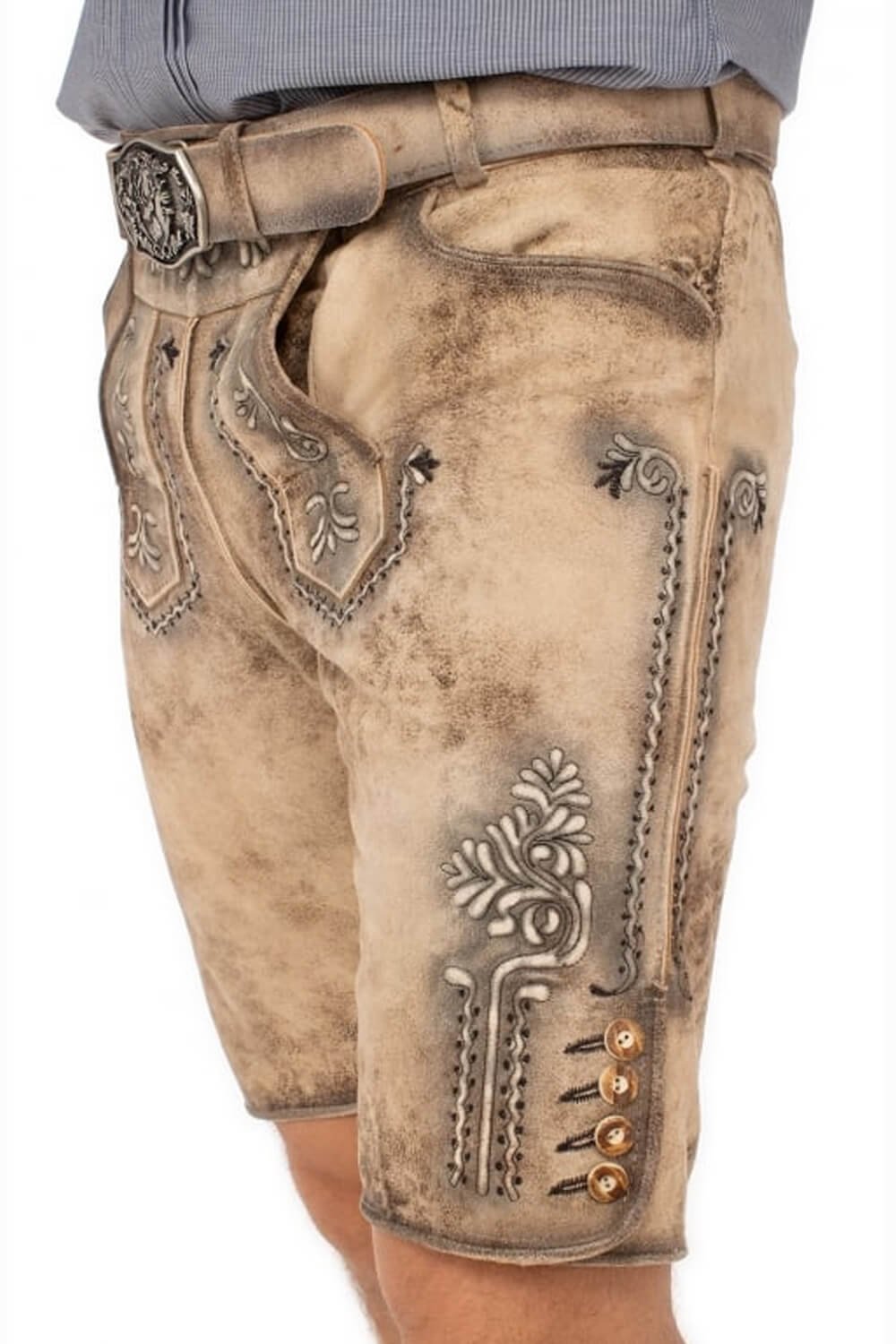 Earthy suede tones highlight the elaborate side motifs on the lower panels and give the shorts a striking, real character. They pay homage to classic German leather shorts while seeming contemporary and useful. Additionally, they complement contemporary styles like Bundhosen and Cargo Lederhosen, which have a similar sophisticated rustic feel, and suit well with festival attire.