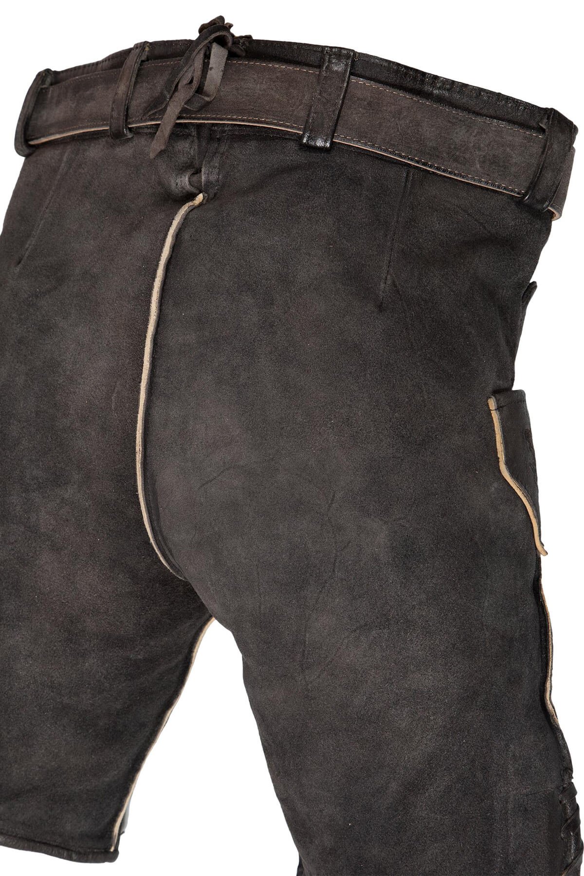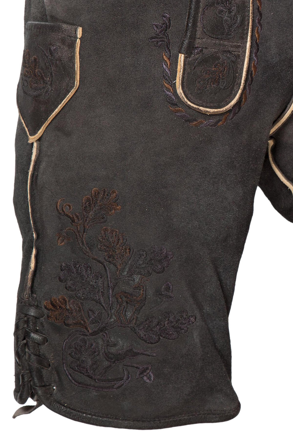 These shorts have a deep charcoal color and a soft goat suede leather texture, which gives them a tough but classy look. The detailed embroidery looks great with the smooth grain of the fabric, especially when worn with Authentic Shorts or a classic Trachten Shirt. The strong construction and plush inside make it comfortable for long parties or gatherings outside.