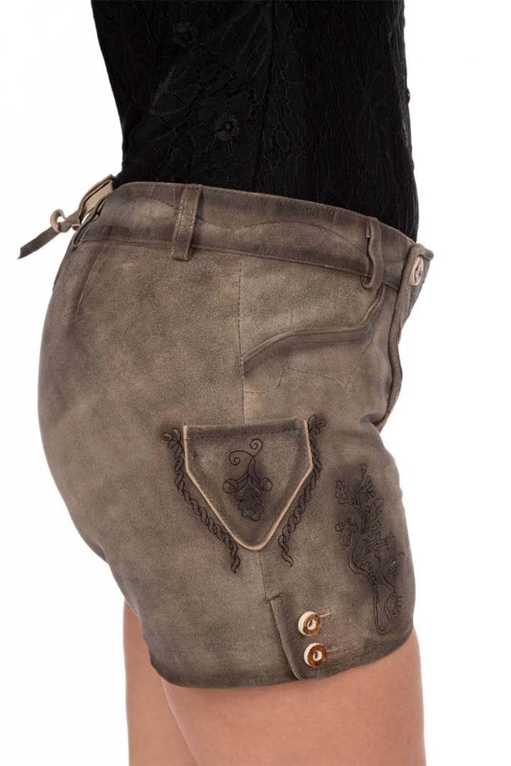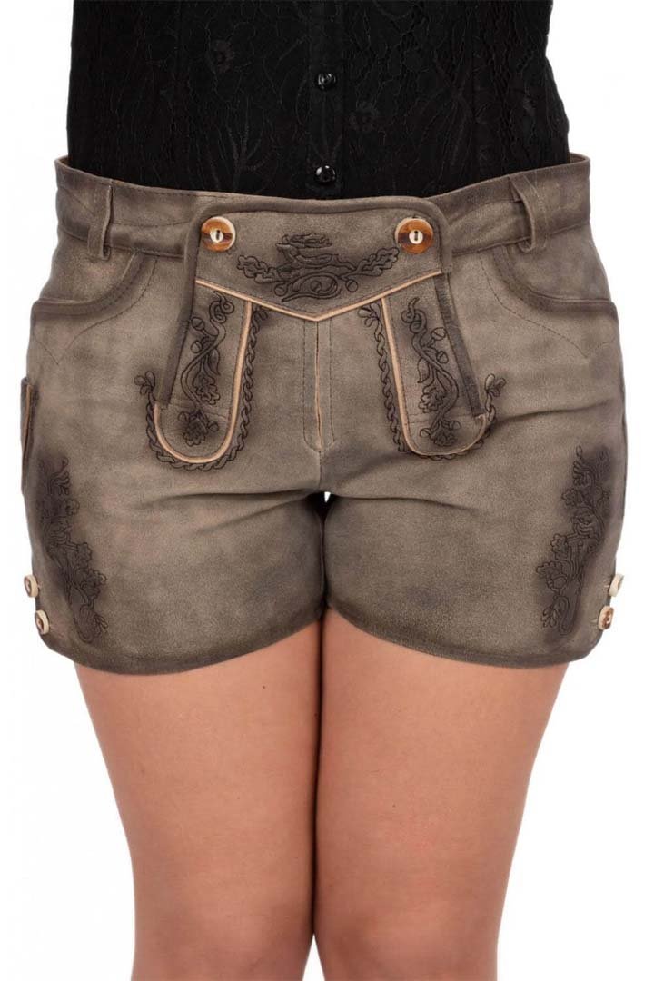 Moreover, the sophisticated distressed antiqued-grey color reveals subtle earthy undertones on closer view. This weathered finish highlights the oak leaf embroidery and creates a Female Lederhosen Outfit that blends rustic heritage with modern femininity. As a result, you can easily pair it with a crisp Dirndl Blouse for celebrations.