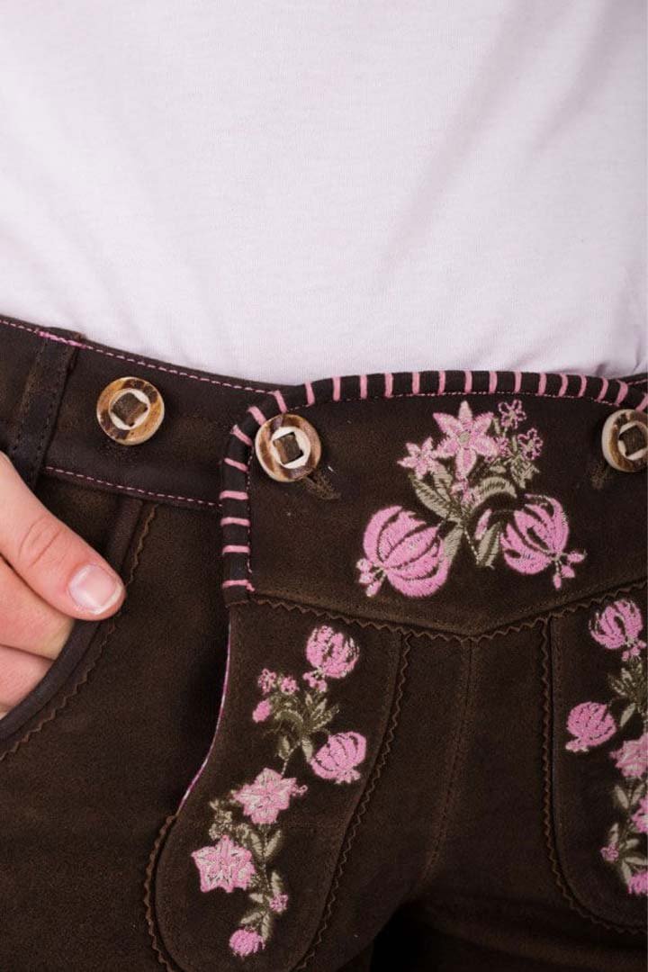 The deep chocolate-brown colour of the Maria Furtwängler Lederhosen by Bavarian Attire exudes classic elegance. Made from high-quality goat suede leather, it is incredibly comfortable and long-lasting. A sophisticated feminine touch is also added by the delicate pink flower embroidery, which exquisitely counterbalances the tough nature of traditional Bavarian Lederhosen for ladies.