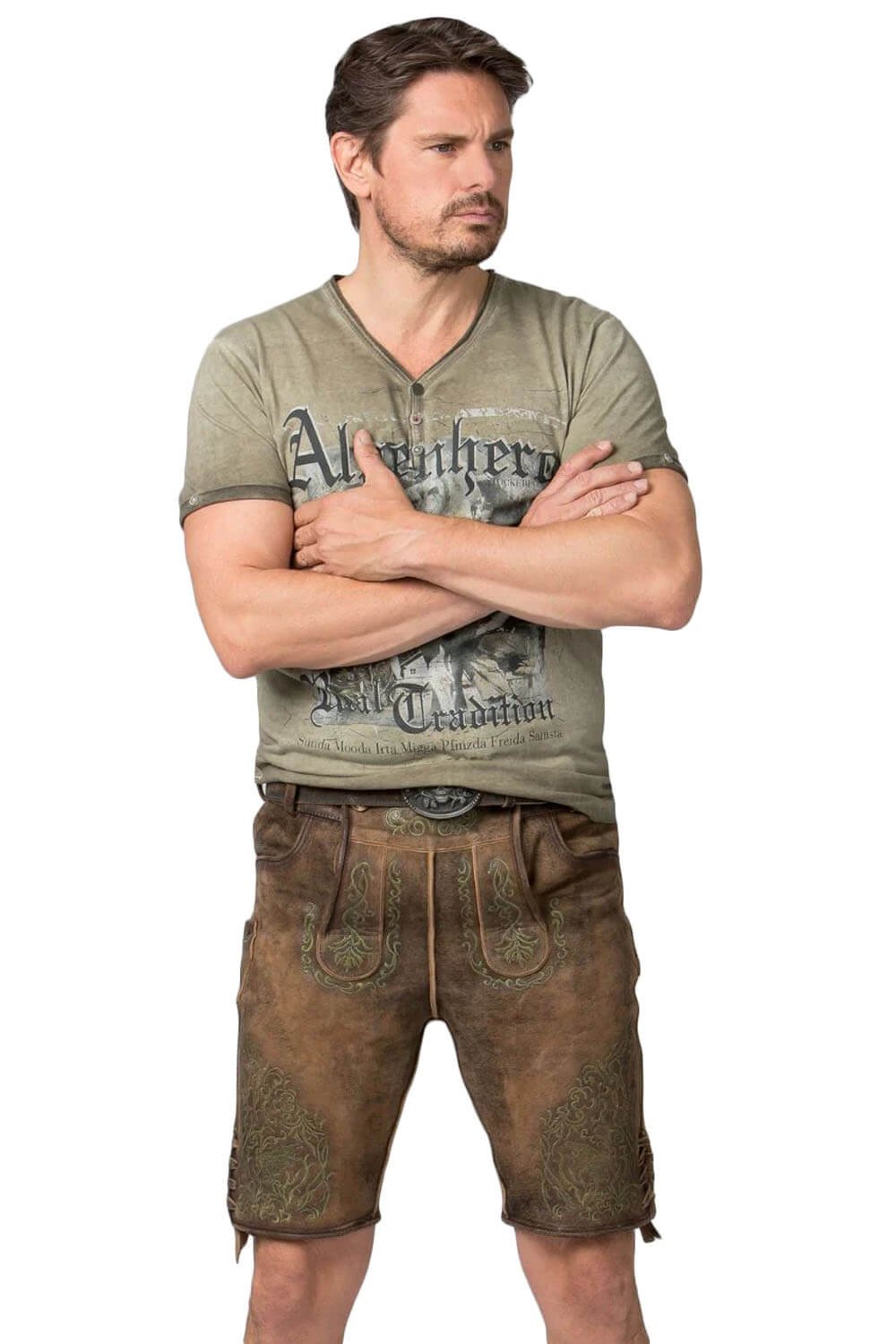 Soft goat suede, earthy tones, and subtle embroidery distinguish these Geneva Lederhosen. Designed for comfort and character, they blend traditional style with practical wearability, offering a refined look suitable for festivals or casual outings.