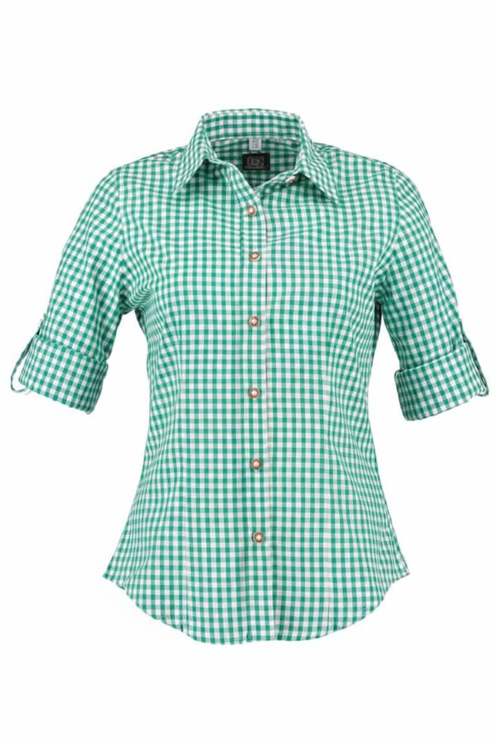 This high-quality cotton green gingham blouse exudes genuine charm. It is the ideal addition to your next traditional Alpine party because it is comfortable and stylish, with adjustable sleeves and rustic buttons.