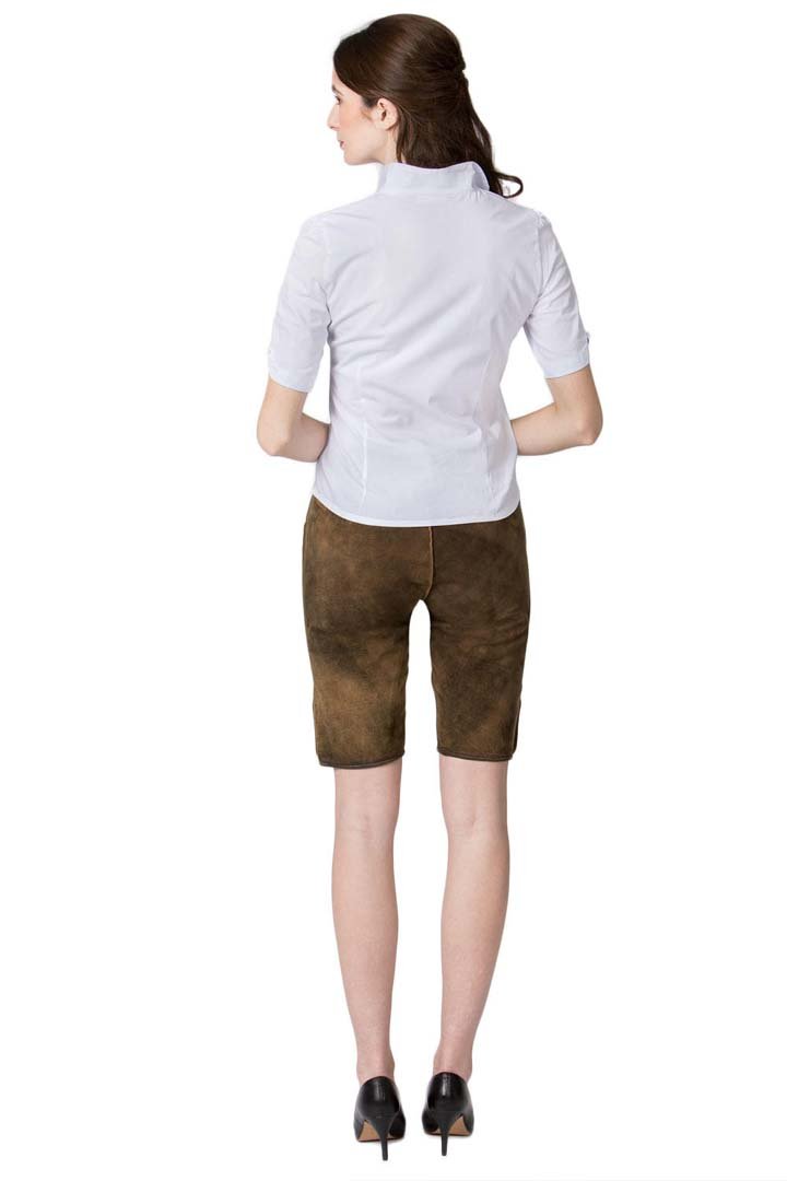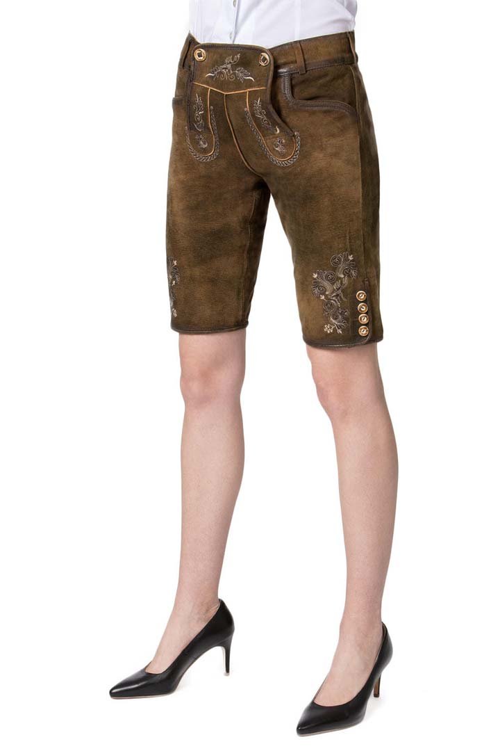 Additionally, intricate floral embroidery decorates the front flap and legs, elevating the overall Women’s Lederhosen design. While the rugged suede delivers durability, the feminine cut shapes a flattering silhouette. Therefore, these breeches form the centerpiece of any Female Lederhosen Outfit, pairing easily with traditional footwear for a classic Bavarian look.