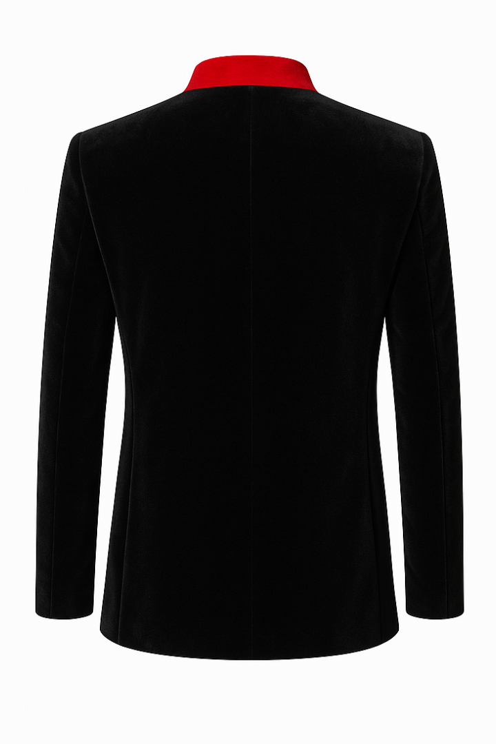 This black velvet jacket with red piping and traditional stand-up collars is a great example of high-quality craftsmanship. This is the best choice for people who want a refined mix of traditional Alpine flair and current evening style.