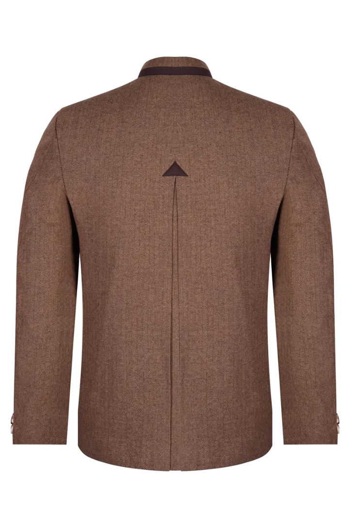 The jacket also has a deep, earthy brown color with a faint herringbone pattern that gives it depth and visual interest. The rough but soft texture feels strong and goes well with Cargo Lederhosen. So, every fiber shows off high-quality craftsmanship for people who care about real culture and high-quality materials.
