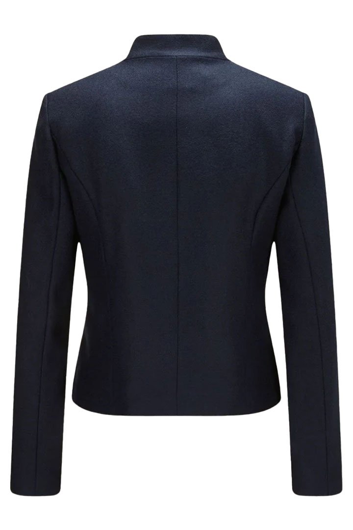 This navy fitted jacket is made of high-quality wool that feels soft and toasty. With its classic look and gold details, this piece adds a touch of refinement to traditional holiday outfits, keeping you comfortable and stylish all season long.