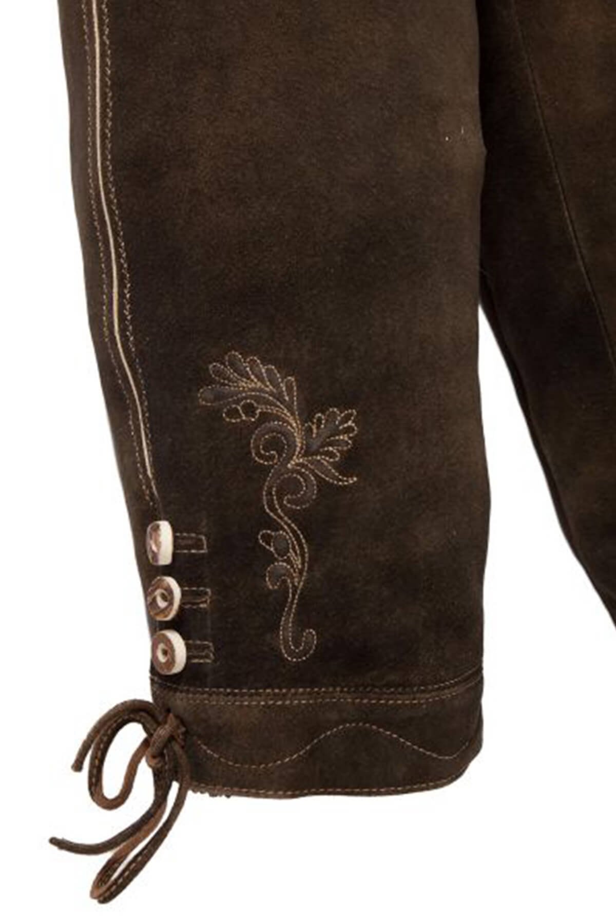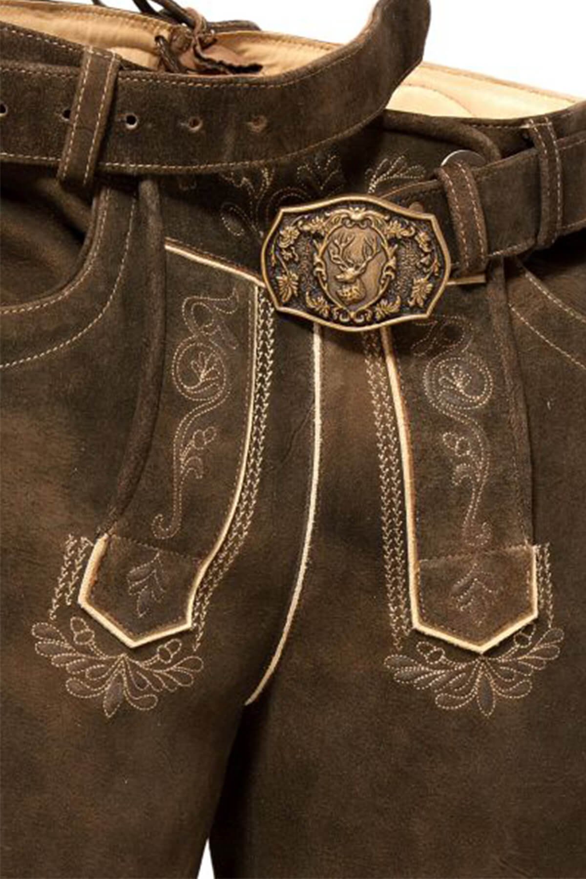 - Detail: Light-toned Bavarian embroidery decorates flap, pockets, legs.