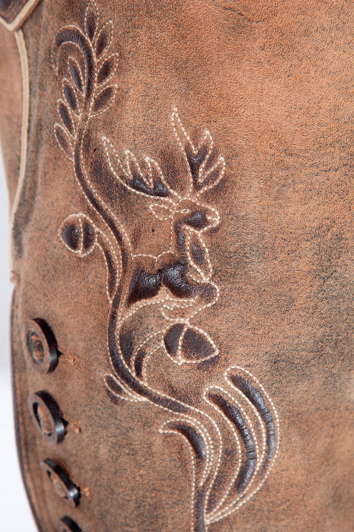 - Material: Distressed tan goat suede leather with a rugged, aged feel.
