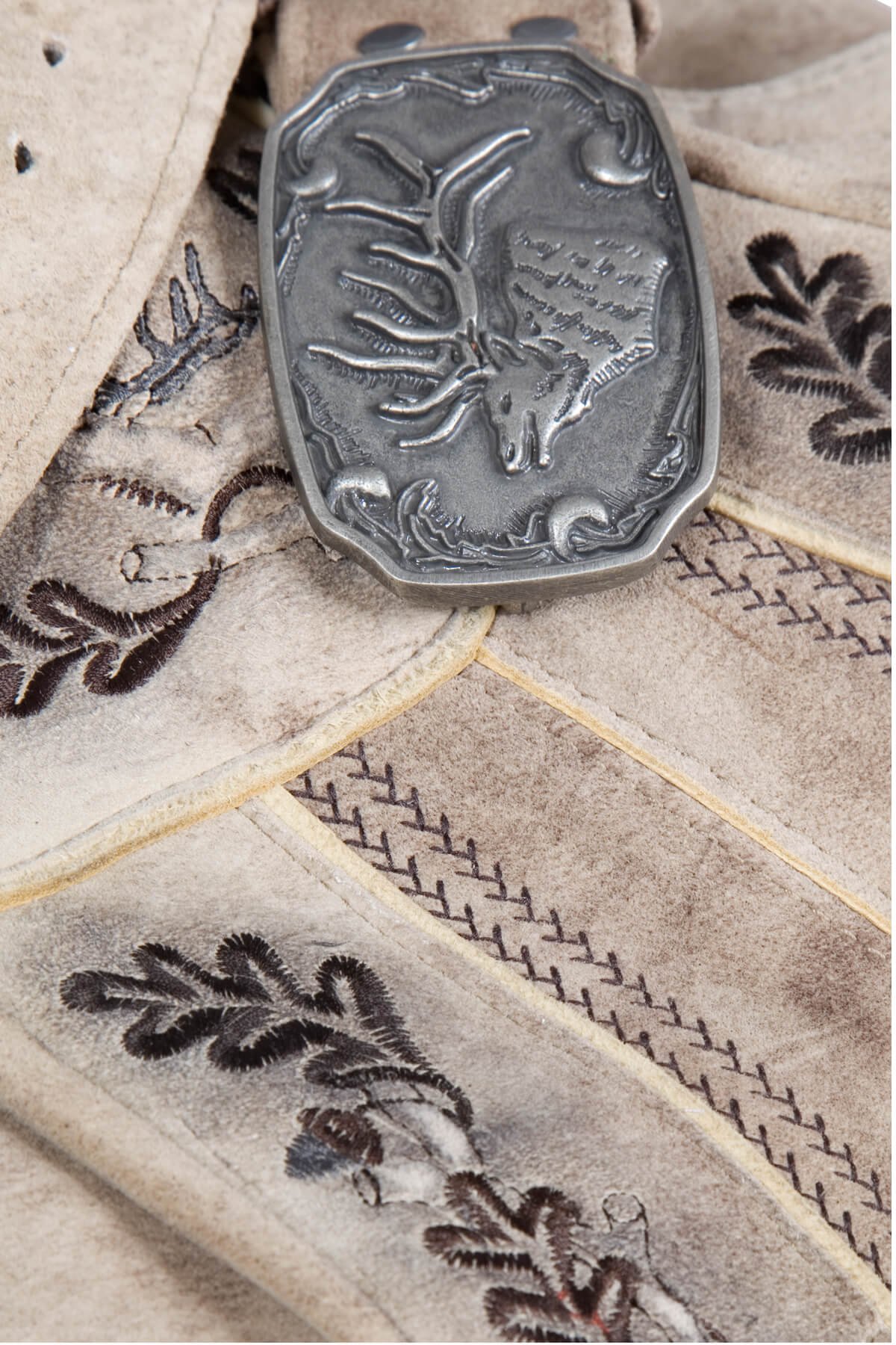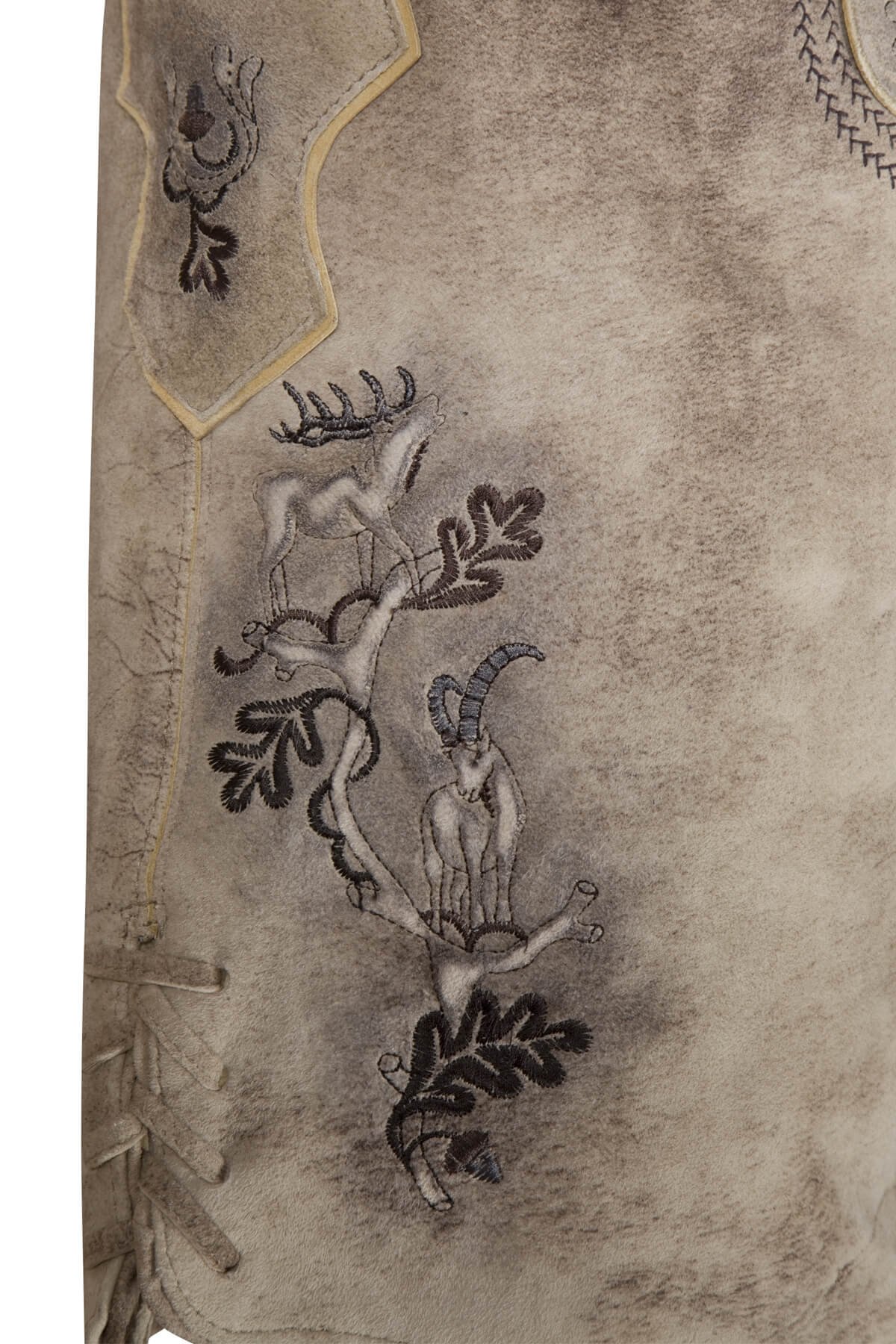 The piece’s naturally faded beige tone is enhanced by delicate gradients that draw attention to the goat suede leather’s suppleness. The garment has a warm, earthy character that is frequently appreciated in a sophisticated Bavarian outfit because of its soft, velvety surface that subtly changes in the light. The front panel’s decorative embroidery creates contrast and enhances the classic appearance without overpowering the garment’s subtle elegance.
