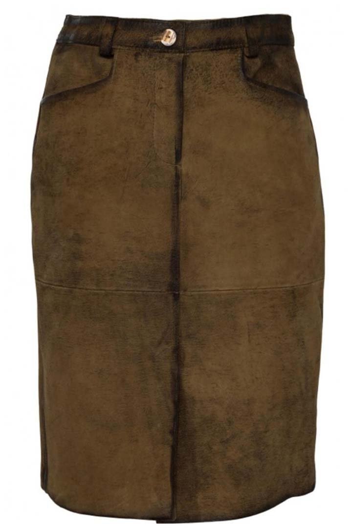 Wear this elegant goat suede skirt to embrace tradition. It is a versatile staple for any classic or modern wardrobe because of its cut fit and distressed olive finish, which offer a sophisticated twist on Alpine fashion.