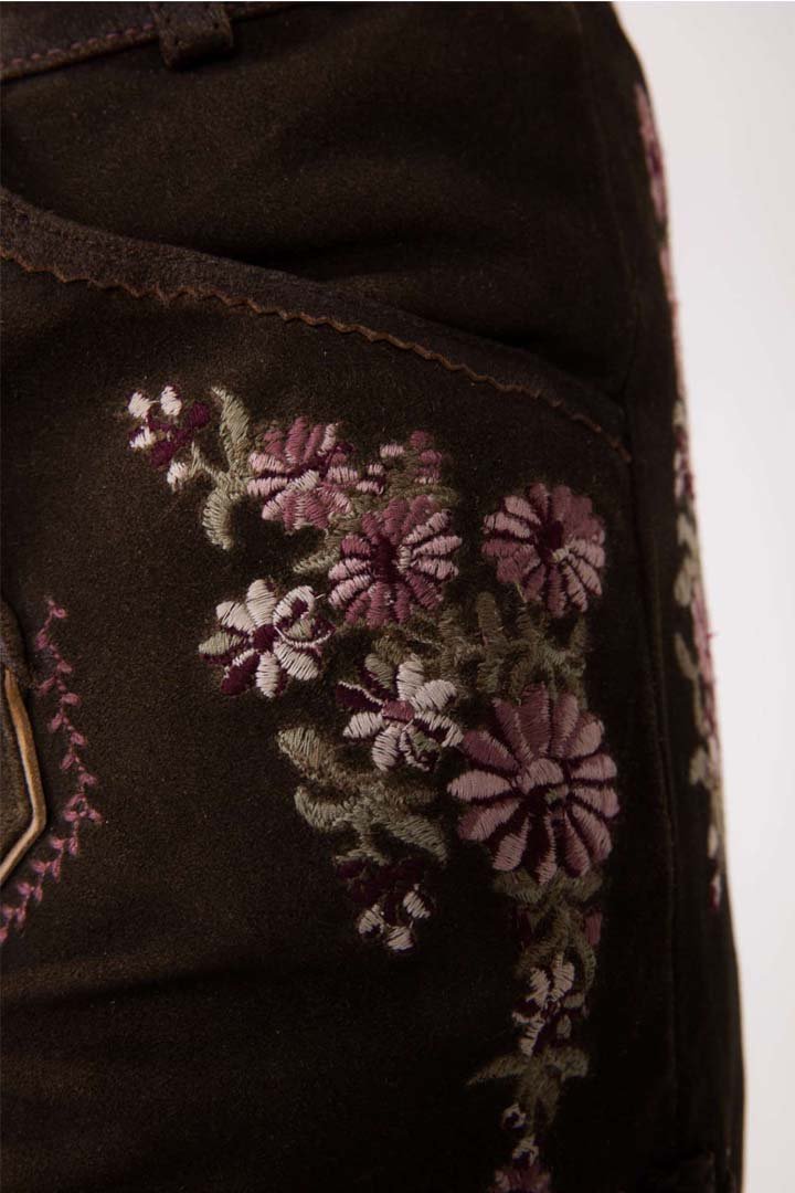 These beautifully embroidered shorts will transport you to the opulent texture of real goat suede. This piece, which is expertly made for comfort and style, creates a very distinctive Alpine impression by fusing beautiful floral craftsmanship with rustic brown tones.