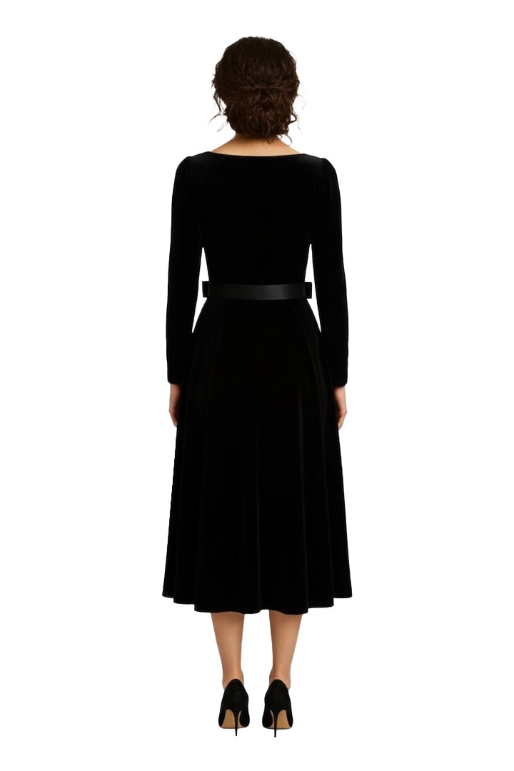 - Fit: Sculpted bodice with elegant midi skirt.