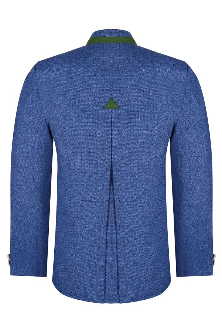The Schander Trachten Jackets is a perfect representation of Alpine heritage thanks to its High-Quality Wool and meticulous craftsmanship. The herringbone weave in denim blue gives it a tough but soft feel. Also, the forest green piping along the stand-up collar and pockets makes a strong contrast. The front is held together by traditional horn-style buttons, which give it a sharp look for formal events or classic Men’s Lederhosen outfits.