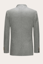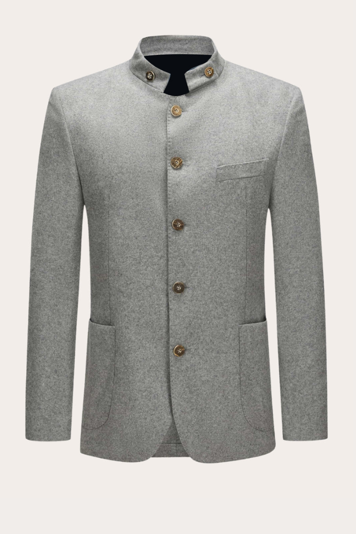 Find a high-quality wool blazer with a sleek stand-up collar and classic horn buttons. This gray outerwear garment is quite adaptable and easily connects old mountain style with modern, sophisticated men’s design.