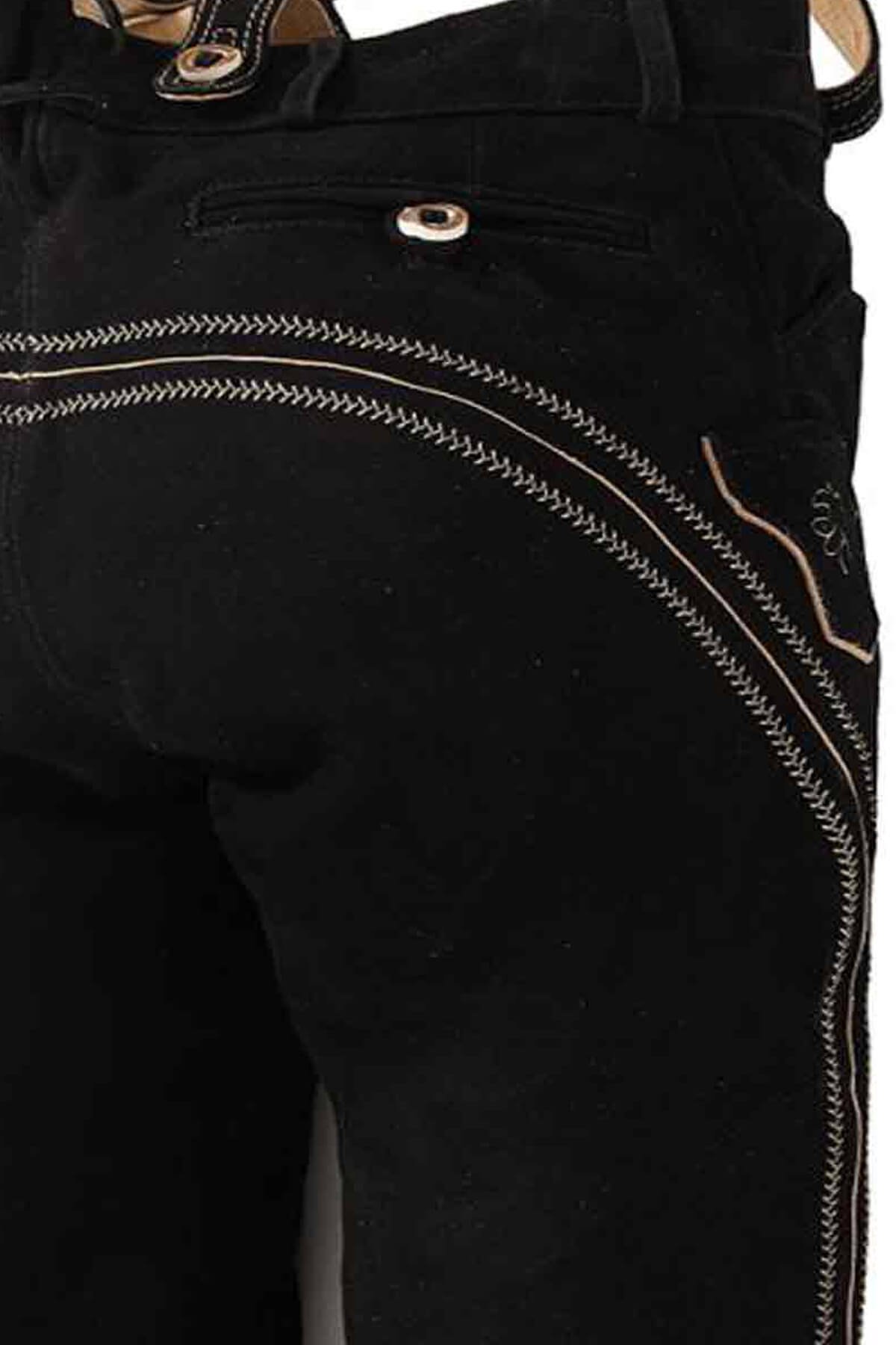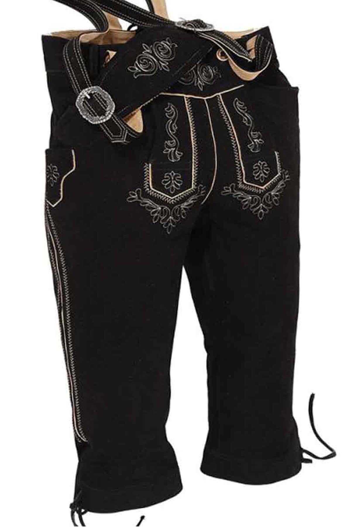 Goat suede feels soft and smooth on the skin, so it keeps you comfortable all day long. Also, the light threads stand out strongly against the deep black cloth, giving the fabric a lot of visual depth. The cloth changes shape while you wear it, so it stays stylish for a long time for Oktoberfest Bundhosen.