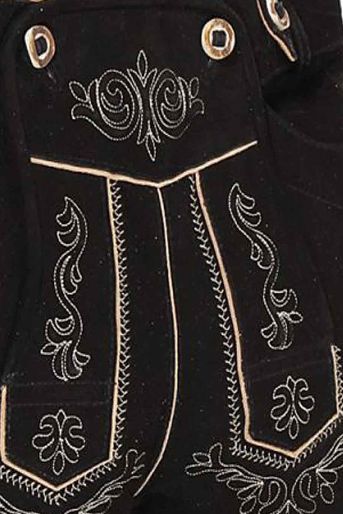 - Detail: Light-toned Bavarian embroidery on bib, pockets, sides.